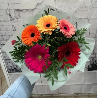 Живой букет сияющих эмоций, который вызывает разнообразие ярких и позитивных ощущений. Герберы - воплощение свежести и радости в каждом пышном цветке. Сочетание разноцветных лепестков создает волшебную гармонию, будто музыка весны. Упаковка подчеркивает его прекрасное содержимое – нежные контрасты, которые приковывают взгляды и пробуждают в душе светлые эмоции. Этот букет — искренний подарок, который наполняет мир вокруг радостью, красотой и положительными вибрациями.
