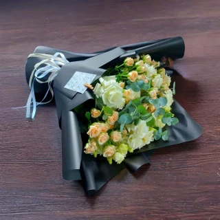 Букет «Звездный вальс» включает в себя волшебное сочетание кустовых и одноголовых роз, которое является воплощением изящества и красоты. Графитовая упаковка дополняет цветы, придавая им еще большую загадочность и огненность. Композиция этих роз создает гармоничный и сбалансированный визуальный эффект, идеально подходящий для важных случаев и романтических вечеров. Этот букет станет символом тонкого вкуса и живых чувств.